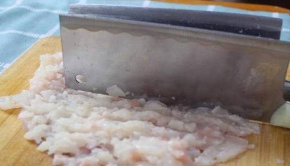 第三步,鱼肉都处理好了,然后剁成鱼肉泥,放入盆中,加清水100g左右,分次加入边搅拌,滴入几滴柠檬汁去去腥味。