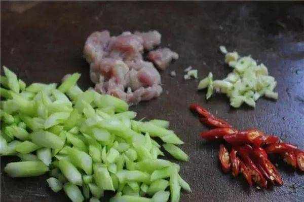 剥了皮的白菜苔放入清水里洗干净备用。将处理好的嫩白菜杆切成菱形片状备用,姜蒜切末,红辣椒切斜片。