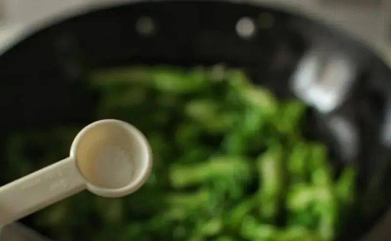 5、菜苔七八分熟的时候放盐调味,然后兜炒入味关火装盘。