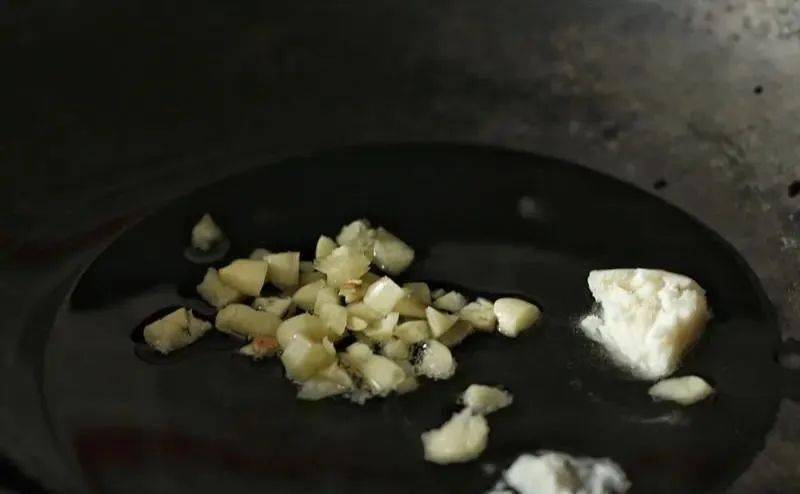 3、铁锅放油烧至六七成热,煸香蒜末,炒蔬菜我喜欢加点猪油一起炒,吃起来蔬菜会软软的,甜甜的。
