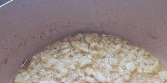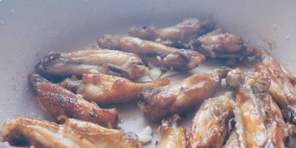 4.再爆香蒜末后,倒入炸好的鸡翅翻炒均匀。