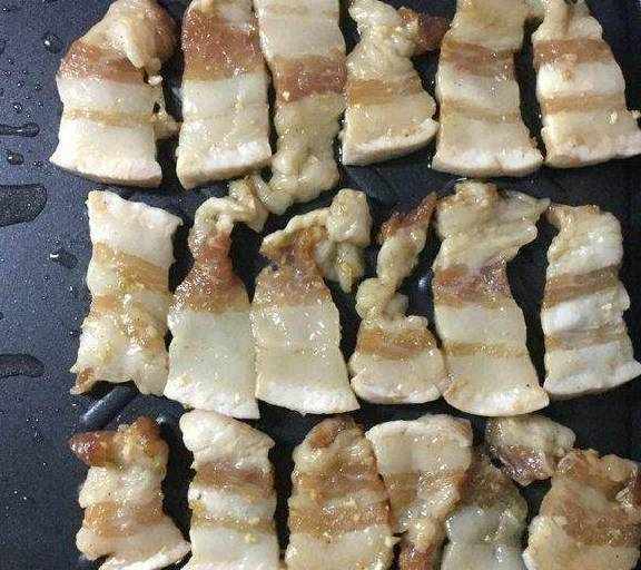 10.把腌制好的五花肉放在烤盘的一遍铺好。