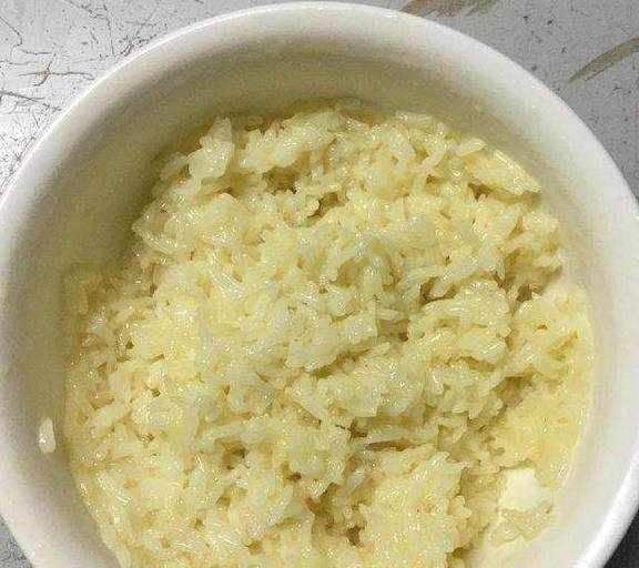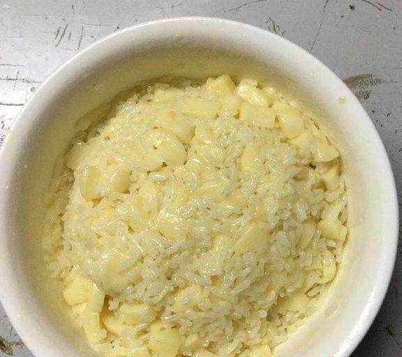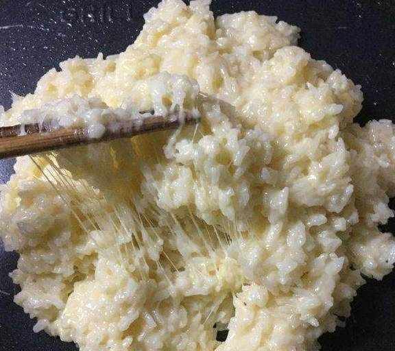 8.把切好的芝士粒放进米饭里,再搅拌均匀。