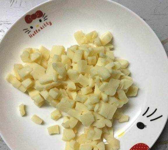 4.拿出准备好的马苏里拉芝士,切成均匀的小粒备用。