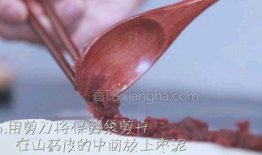 5.用剪刀将保鲜袋剪开,在山药皮的中间放上去枣泥。