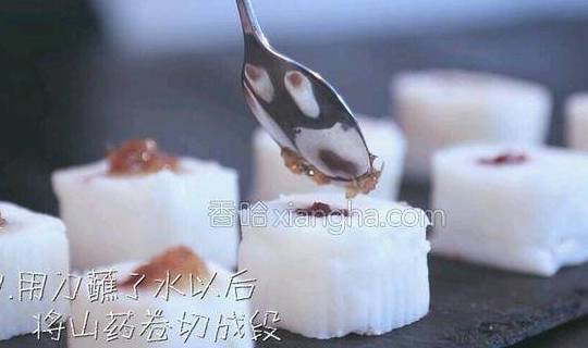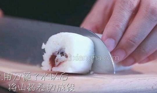 7.用刀蘸了水以后,将山药卷切成段。