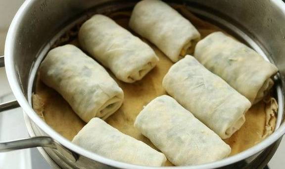 16.汤锅加水,上面放蒸格,铺上纱布,放入做好的卷煎,中间留有空隙。