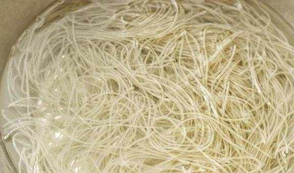 2.粉条用开水烫一下,然后再浸泡一会,至完全变软。韭菜做馅料容易出水,但是加入粉条之后就会吸收其中的水分,馅料就不会有很多水了。
