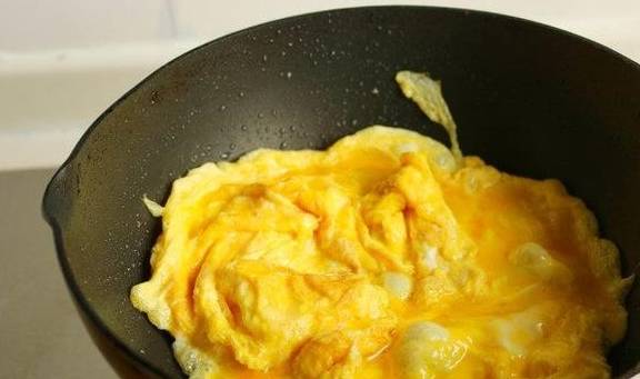 5.炒锅放油,放入打散的蛋液,炒熟。可以看到颜色金黄,香味也很浓。我喜欢鸡蛋煎的嫩一些,会更好吃。