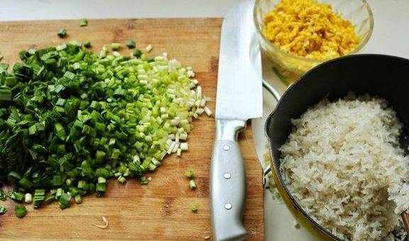 6.煎好的鸡蛋切碎,韭菜也切碎,同时葱姜也切末。