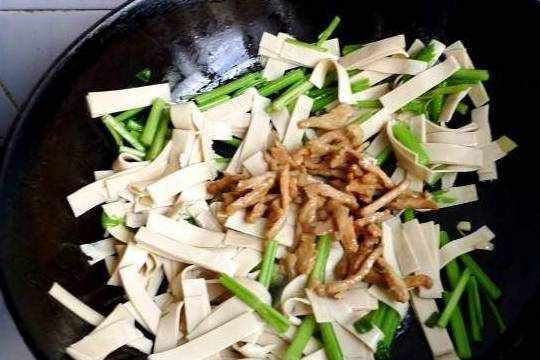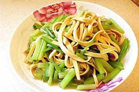 芹菜炒豆腐皮的做法如下: