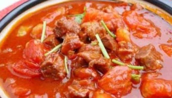 2、重新坐锅加清水,加入焯过的牛腩和葱姜大火煮开,转小火慢炖1小时,加入西红柿块再继续再炖1小时;