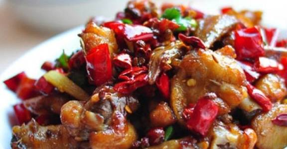 3、锅中留少许底油,加入干红辣椒圈和花椒小火煸炒出辣香味,放入葱姜蒜爆香,倒入炸过的鸡块翻炒几下;