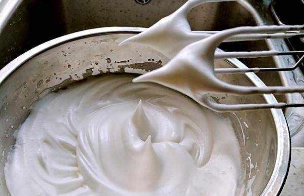 2. 蛋白要完全打发,蛋白粘在打蛋器上能立起来不倒,在蛋白中划八字不会消失,这种程度就可以了。