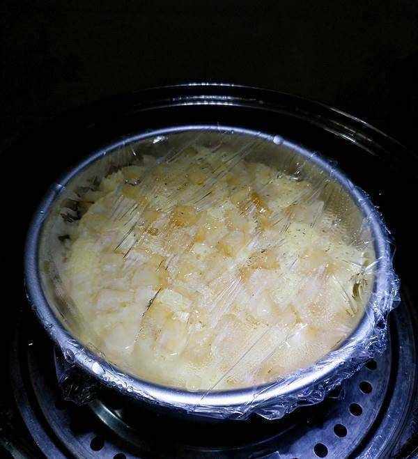 5. 蛋糕蒸好之后,不要立马掀开锅盖,否则高温的蛋糕突然遇冷会回缩,变得不蓬松。待5分钟之后,再掀开锅盖取出。