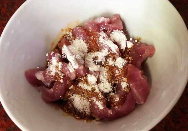 4、碗中加入适量淀粉和酱油,搅拌均匀;然后腌一会儿;