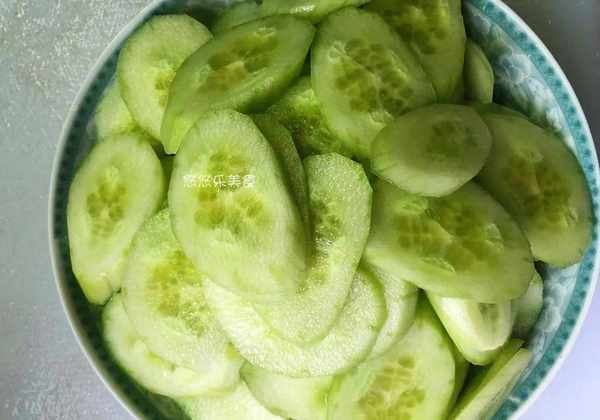 2、准备好的黄瓜用刀切成薄片,放入锅中待用。