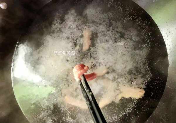 6、做这个汤的时候不需要加油,锅里加入适量的水即可。水开后,将腌制好的瘦肉放入热水中,一块一块放入,防止肉块粘在一起;