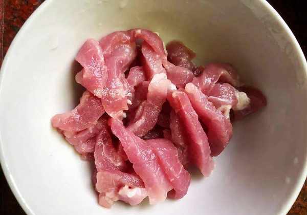 3、将准备好的瘦肉用清水冲洗干净,将洗净的瘦肉放在案板上切成细条,切好放入碗中待用;