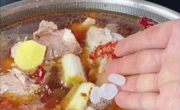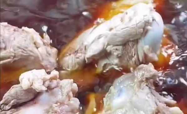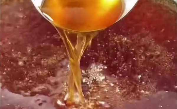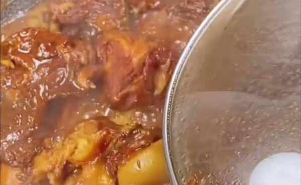 锅烧开至呈糖状,锅中加入半茶匙油,然后加入冰糖。这必须用小火煮沸。切勿使用大火。很多人都煮不好,一煮就变苦了,所有的材料都浪费了。向上。今天教大家一个小技巧,变成麻油色就马上关火,用余温继续煮,直到变成栗色,效果就可以了。马上加入开水,一定要加开水,这样熬出来的糖色才会红润亮丽。这样做是100%成功的,一点也不苦。