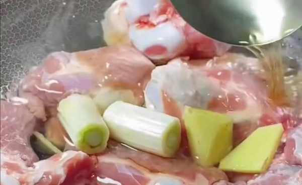 首先将大棒骨清洗干净,浸泡五分钟,洗去表面的血水。锅内开水一定要冷水下锅,放入大块葱姜,再加入少许料酒去腥,拍去表面浮沫,煮五分钟,捞出放入盆中,加入开水,洗去表面杂质控水备用。