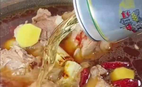 然后加入一大块葱和姜,加入豆腐乳去腥提香,再加入一勺黄豆酱,少许生抽,蚝油提鲜,老抽提色,倒入一瓶啤酒,加盐,鸡精,味精,炒油,然后加几粒冰糖,盖上锅盖小火炖40分钟,时间长了满屋子的香味,酱汁和大骨头又软又好吃,你学会了吗?