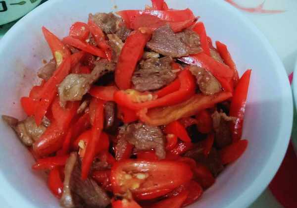 今天用红辣椒和牛肉炒了一碗菜。光是看着就有食欲。就连不爱吃辣的侄女们也很喜欢。他们总是说很好吃。辣椒不辣,牛肉很嫩,看来炒牛肉也很重要。做不好,柴火就不好吃。这次多了一道工序,又嫩又好吃。