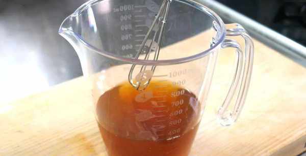4、提前准备一杯料汁,100ml水,加入10ml生抽,10ml料酒,香油,适量鸡精,白糖少许,水淀粉适量。