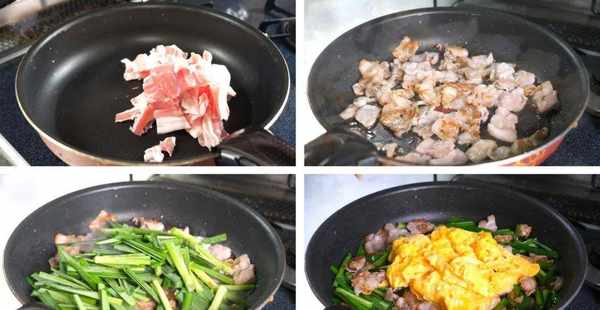 6、再起锅,不放油,放入肉片,炒至肥肉呈褐色,再放入韭菜段,将韭菜炒碎,加入鸡蛋翻炒均匀即可食用。