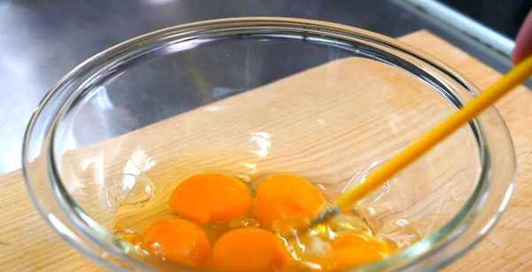 5、准备一个煎锅,低温煎鸡蛋,油温上升后倒入鸡蛋,用筷子搅拌至半熟,盛出。