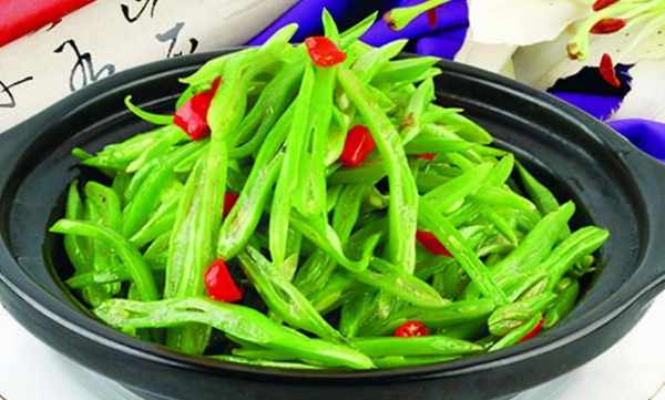 第三步:闻到蒜香时,开火,加入扁豆丝翻炒三分钟左右。