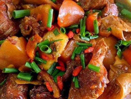 打开锅盖,开火收一下汁,撒上香葱和枸杞子,鲜香味浓的古方红糖秘制土豆炖牛肉就做好了!是不是超级简单方便?
