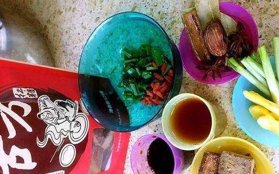 1、首先把牛肉洗净,加生姜老酒冷水下锅焯一下水,再用漏勺捞出备用;准备好各种调味料,生姜洗净去皮切片,葱洗净取葱白部分,草果,香叶,茴香桂皮,古方红糖;
