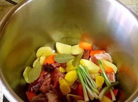 2、然后把牛肉、土豆和胡萝卜切成小块,并将所有材料放入压力锅中;