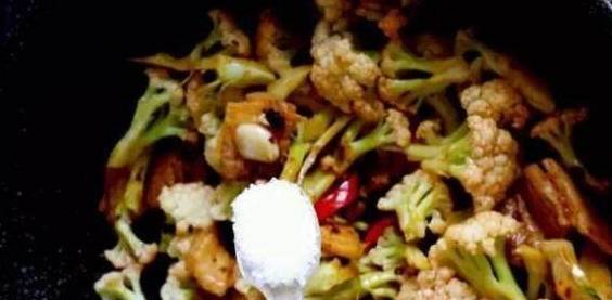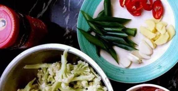①花菜泡水里20分钟,水里放一小勺盐菜花掰开小朵,五花肉切稍薄片,蒜姜切片,红椒葱绿切段。如果有青蒜代替葱绿更好。