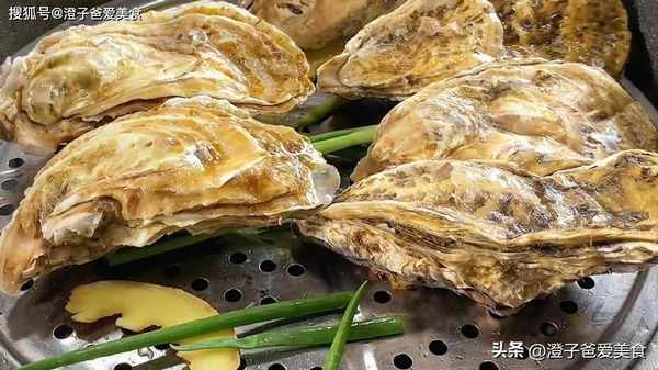4.蒸屉上面垫几片姜,两根小葱,把生蚝放在蒸屉上面,扣上盖子,开大火烧开,上气后蒸三分钟,生蚝经过高温就会自动开口,再用小刀把外壳给掰开,用流动的清水把生蚝里面也冲洗干净,