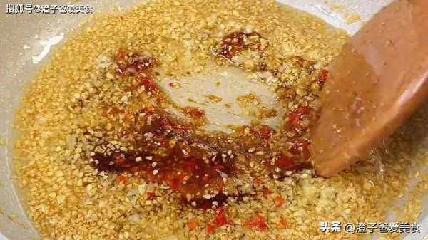 5.接下来开始制作蒜蓉,锅中加入多一点的食用油,油温三成热时,先清洗过的蒜蓉倒在锅里面,慢慢翻炒,把蒜蓉炸制微微变黄,就可以把火关掉了,再把另外一半蒜蓉给倒下去,小米椒末也倒下去,用余温给它翻炒均匀,放入一勺蒸鱼豉油,一勺蚝油、小半勺白糖,翻炒均匀,这样蒜蓉就炒好了,