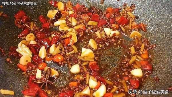 6.锅中油热,倒入干辣椒、花椒、八角爆香,再倒入姜、蒜、小米辣,炒出蒜香味,加入一勺郫县豆瓣酱,炒出红油,