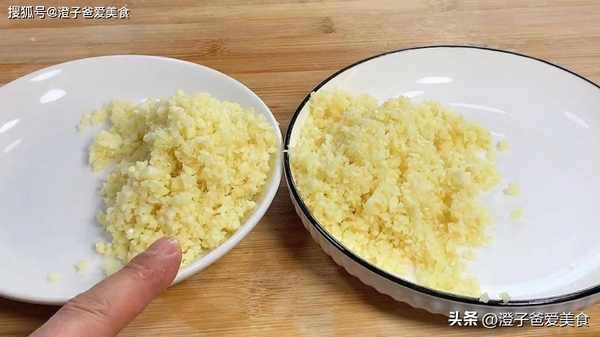 2.准备多一点的大蒜子放在案板上,用刀把大蒜子切碎,也可以用拉蒜器把它拉成蒜蓉,稍微剁细一点,再把剁好的蒜蓉分成两份,再分别放在盘子里面备用。