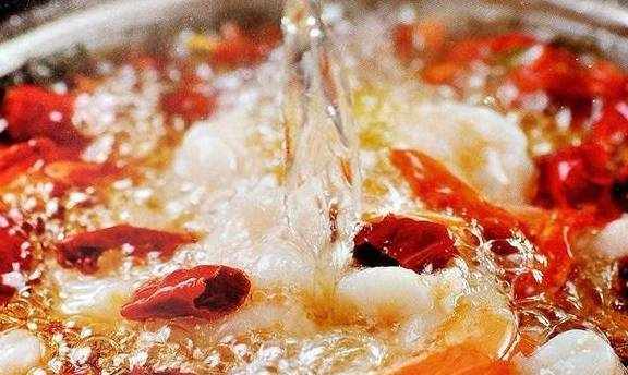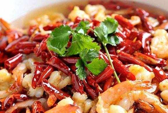 3、锅中加油大约需要半锅,烧开,大约五成油温,加入干辣椒、胡椒、麻椒,大约油温七成,将热油倒入准备好的虾上面,用热油将虾烫熟。