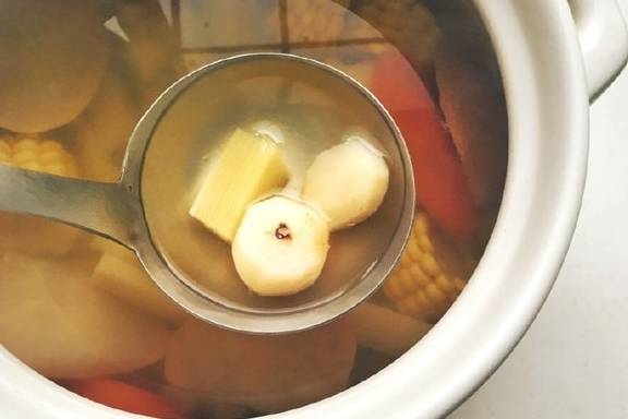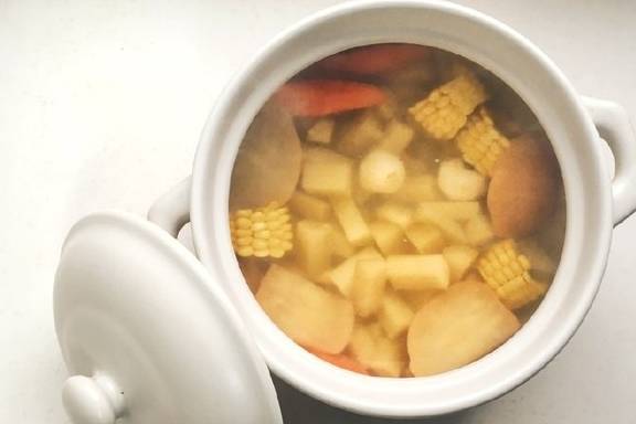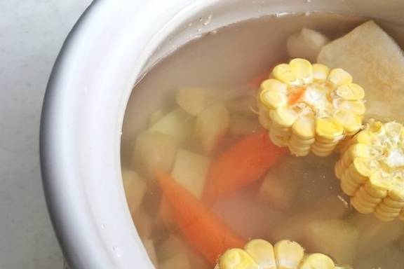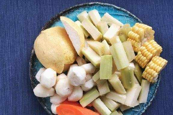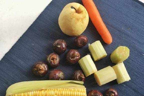 1.荸荠8-10个,去皮洗净;甘蔗10-15段,每段切分为4小条;胡萝卜1根,去皮切段;雪梨1个,洗净切成大块;玉米半根即可,洗净切成厚片。