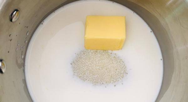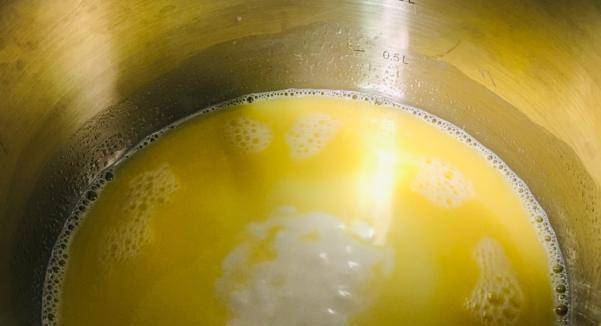 那么,我们把这些牛奶黄油和糖都放进奶锅里后,我们必须点火把它煮热,而且,我们在煮的时候必须用勺子搅拌,这样的话,就能保证这个黄油迅速融化,我们可以把牛奶煮到周围使其起泡。