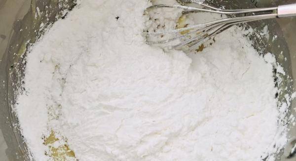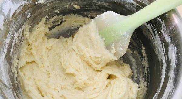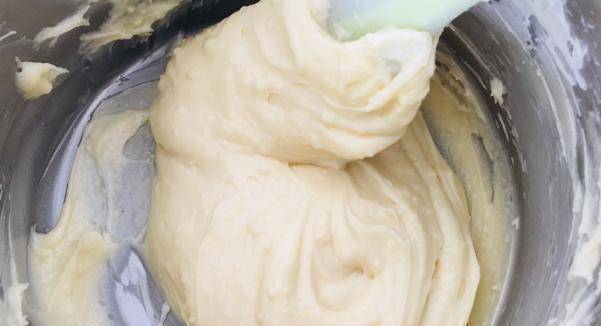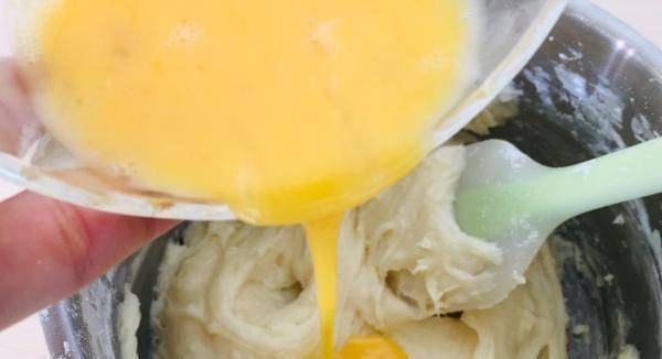 但是,我们放鸡蛋液的时候,不能一次全部放进去,我们需要分成3次或4次,放入这个糊精中,每次放入蛋液后,均匀搅拌之后再放入。