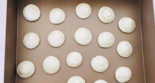 然后我们把这块布料搅拌成光滑的状态,把它拿起来,做成三角形,然后我们把它装进包装袋里,装进包装袋后,可以在准备好的盘子上涂上食用油,在这个盘子上挤出同样大小的面团。