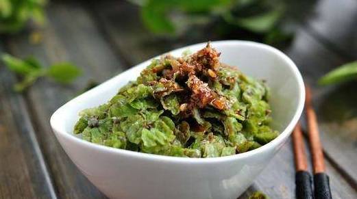 3.把笼布打湿后,将调好味道的榆钱儿放在上面,水开后中火蒸15分钟即可。