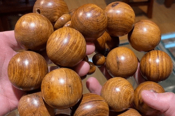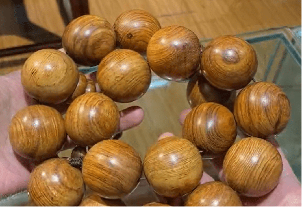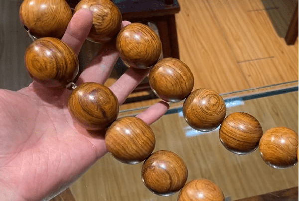 所以大家认为越南的北部湾老料,就特别像海南黄花梨,那传统的老的越南黄花梨,也就现在说的南部料长什么样子?接下来来看一下老越南黄花梨,南部料长什么样子,图片中这是一条越南黄花梨的手持,一看做工珠孔就可以发现是2010年之前的老货,因为当时的珠孔打的都比较大。