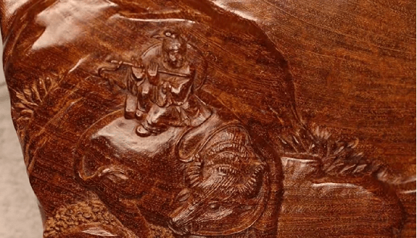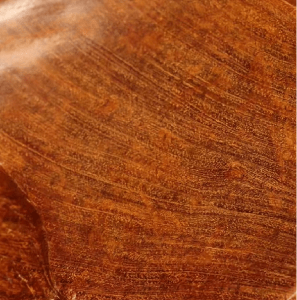 这种直纹都是很标准的越南南部料的特点,再有就是纹理,纹理经常会出现一种偏艳丽的颜色,颜色不像咱们看到传统黄花梨的黑色或者棕褐色,会有一点点发红或者发褐色,而且可以看到圈状的纹理,边缘是齿状纹理,这种也是越南南部料比较大的特征。