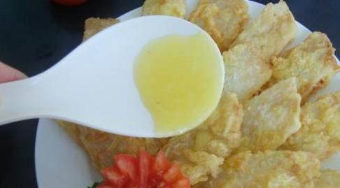 4、把沾好面粉的冬瓜片放在热油锅里面炸,直到变成金黄色就可以起锅了。先放一边摆盘。