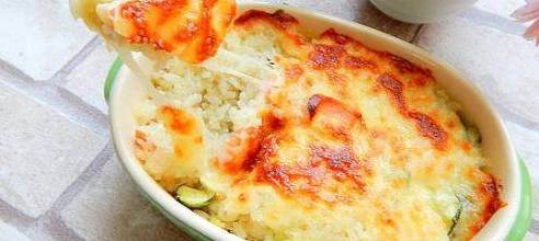 5、加点鸡精炒均匀就可以放在烤盘里了,然后把切碎的芝士铺在饭上面,放在烤箱里用一百七十度烤上大概二十分钟。
