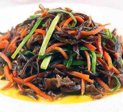 2、在炒锅里面放点植物油,直到七成热的时候,就可以把切好的胡萝卜丝放进去炒一会,然后把木耳丝放进去再炒大概一分钟。